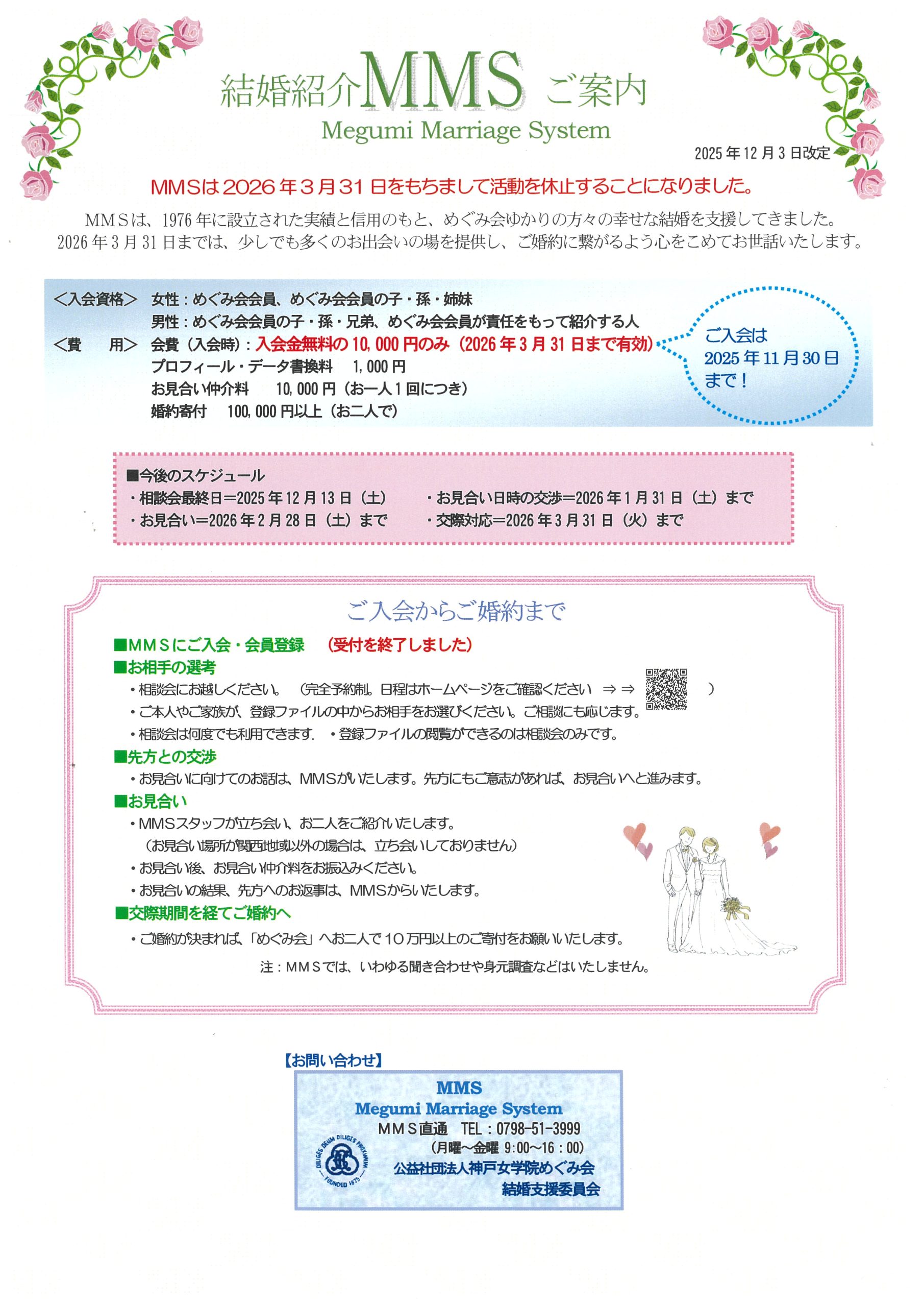 1976年に設立されたMMSは、めぐみ会ゆかりの方々の幸せなご結婚を目指して活動してまいりましたが、誠に勝手ながら、諸事情により2026年3月31日をもって一旦休止することになりました。 皆様のご理解とご協力のもと、MMSは多くの会員にご登録いただき、活動してきました。お見合いやご婚約の数が増える事は、私どもお世話をする役員にとっても大きな喜びとなっております。