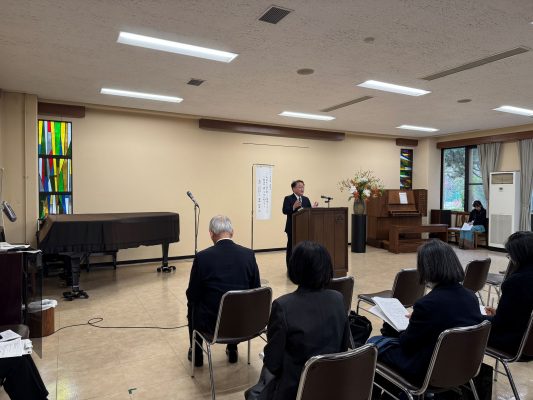 午後からは、日本基督教団同志社教会牧師・菅根信彦先生をお迎えし、「この日から愛が新しい意味をもった―創立の時を心に刻んで―」と題した講話会が開かれました。先生は、聖書の示す二つの時間概念「クロノス(流れる時間)」と「カイロス(特別な時)」を示し、1874年に創立された摂津第一公会の誕生を「カイロス」として捉える視点に触れられました。