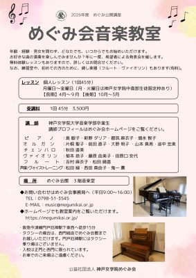 | レッスン | 1回45分 個人レッスン(対象:幼児から大人まで) 月曜日~金曜日 レッスン日時はめぐみ会事務局にお問合せください。 (月・火曜日は神戸女学院中高部生徒限定枠あり) 前期4月~9月 後期10月~3月 |